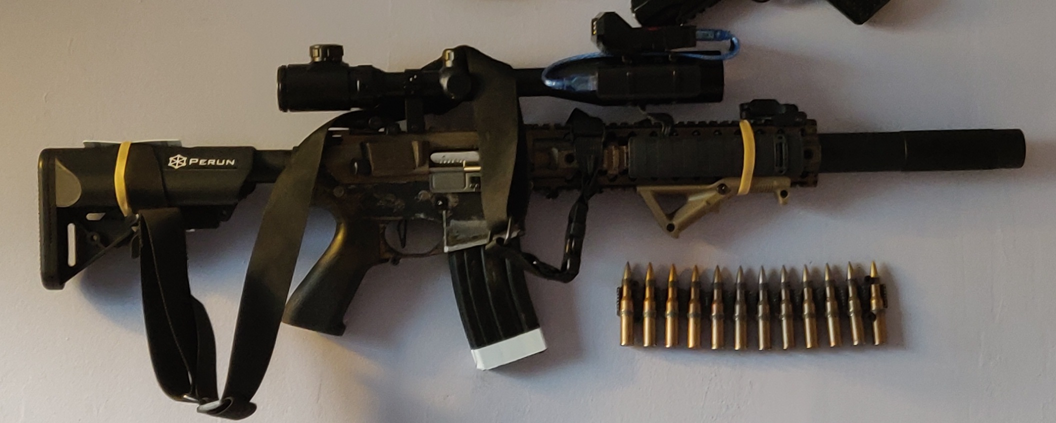 using an Arduino computing unit I was able to create a feedback system with an IR sensor that produces a small beam when broken outputs a 5volt signal which in return is interpreted as a binary 1. this causes the set countdown on the display to drop by 1 each time the beam is broken, this then happens until the counter reaches either 0 or the magazine is switched out at which point the reset switch is to be activated automatically or manually. A 7 segment display is used to show the number of bullets remaining in the magazine, this can later be swapped out for a liquid crystal display if more information needs to be displayed such as ROF and temperature.